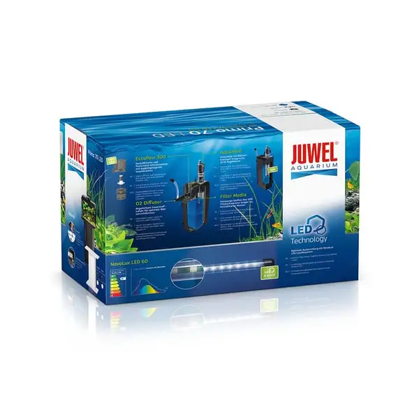 Das Juwel Aquarium Primo 70 weiß ermöglicht einen unkomplizierten und schnellen Einstieg in die Welt der Aquaristik. Die moderne LED Beleuchtung und die effiziente Filterung runden das Primo-Konzept optimal ab. Das rechteckige Aquarienbecken überzeugt in einem zeitlosen Design, das sich ideal der Wohnungseinrichtung anpasst. Darüber hinaus gewährleistet der Sicherheitsunterrahmen einen besonders sicheren Stand und erlaubt eine problemlose Aufstellung des Aquariums ohne spezielle Unterlagen. Das Komplettset ist zudem mit einem leistungsstarken Bioflow One Filtersystem ausgestattet. Der Innenfilter, der besonders effizient arbeitet, ist mit zwei feinporigen Filtermedien und einer leisen aber kraftvollen Eccoflow 300 Umwälzpumpe versehen. Der AquaHeat Regelheizer (50 Watt) ist unsichtbar im Wasserkreislauf integriert sorgt für ideale Temperaturverhältnisse im Aquarium. Die Abdeckung des Aquariensystems ist zudem mit einer energiesparenden NovoLux 60 LED Leuchte (8 Watt) versehen. Machen Sie Ihren geliebten Fischen und sich selbst mit dem Juwel Aquarium Primo 70 in der Farbe Weiß eine tolle Freude.